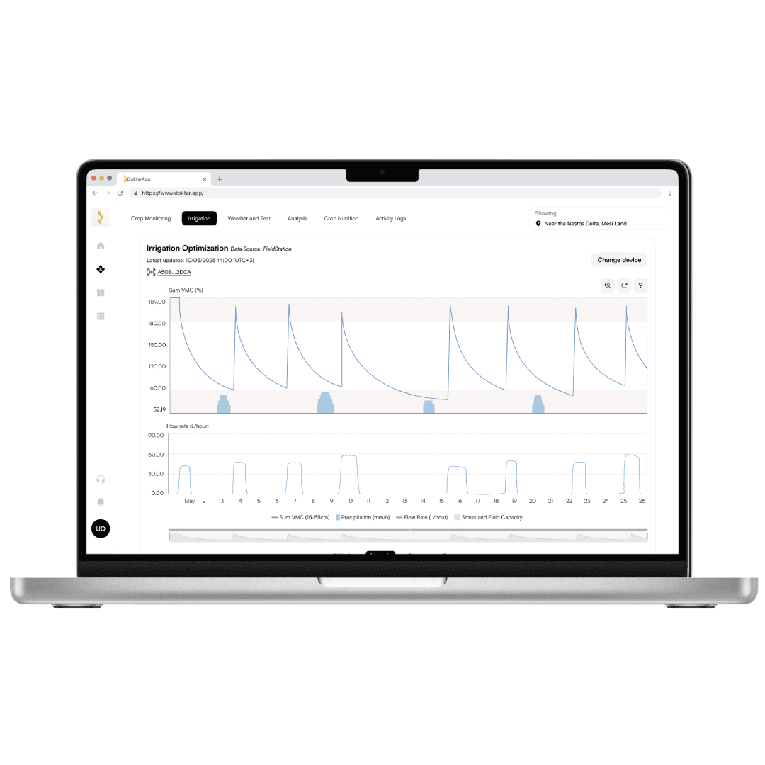 Doktar integrates soil data, crop development, forecast intelligence, and root-zone behavior to optimize irrigation timing and volume.