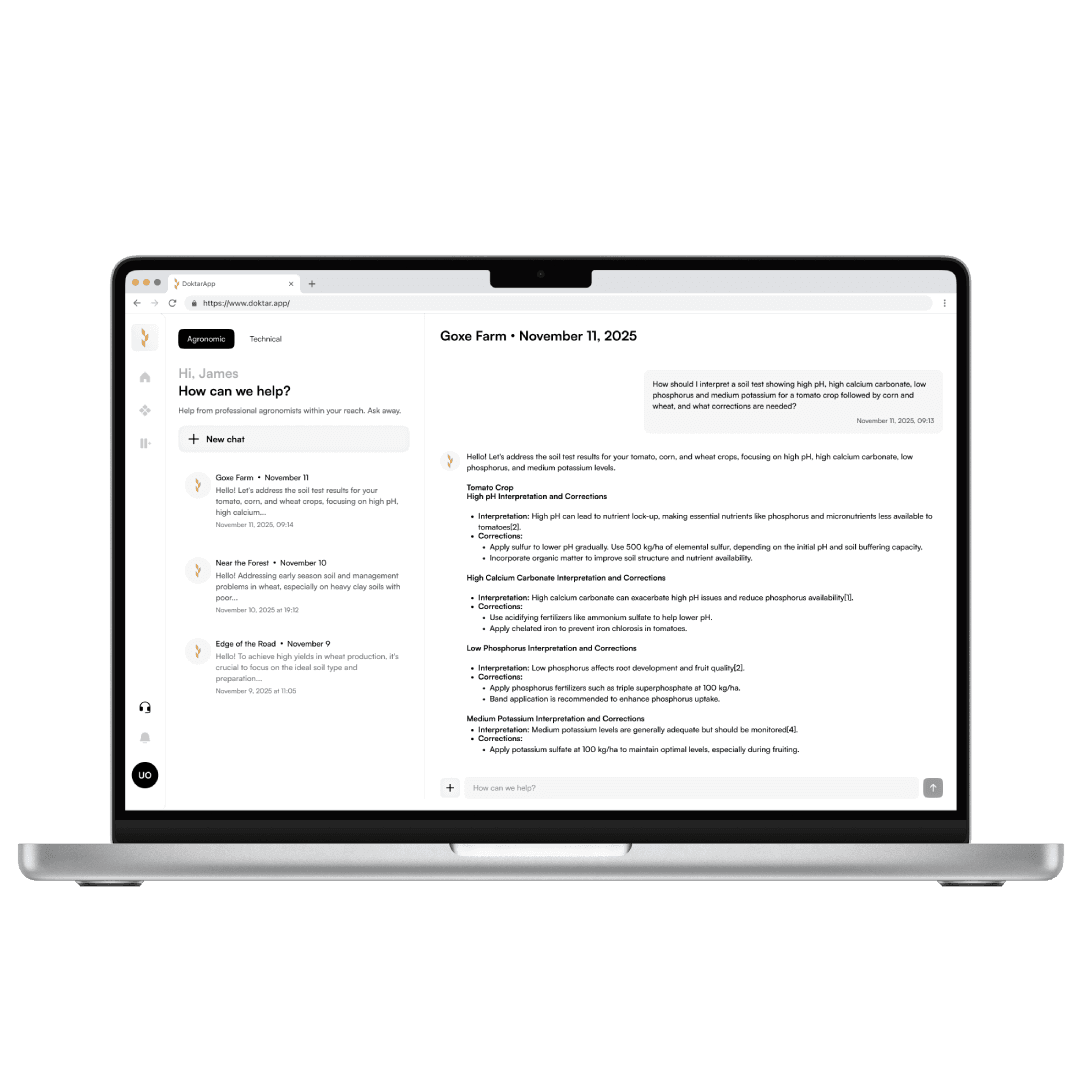 Doktar's LLM synthesizes satellite, sensor, weather, and yield data into field-specific guidance through natural conversation.