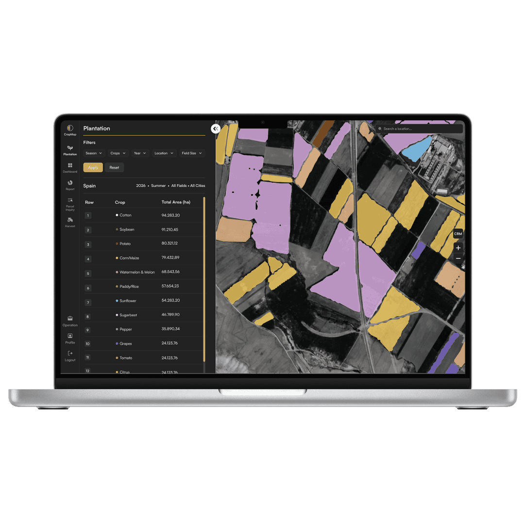 20+ crop types identified for area verification and rotation tracking.